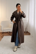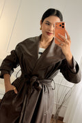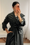 Trench coat comprido em napa macia, com lapelas largas e cinto ajustável que valoriza a silhueta. Corte fluído com bolsos laterais e fecho frontal, peça versátil e sofisticada para looks contemporâneos.