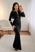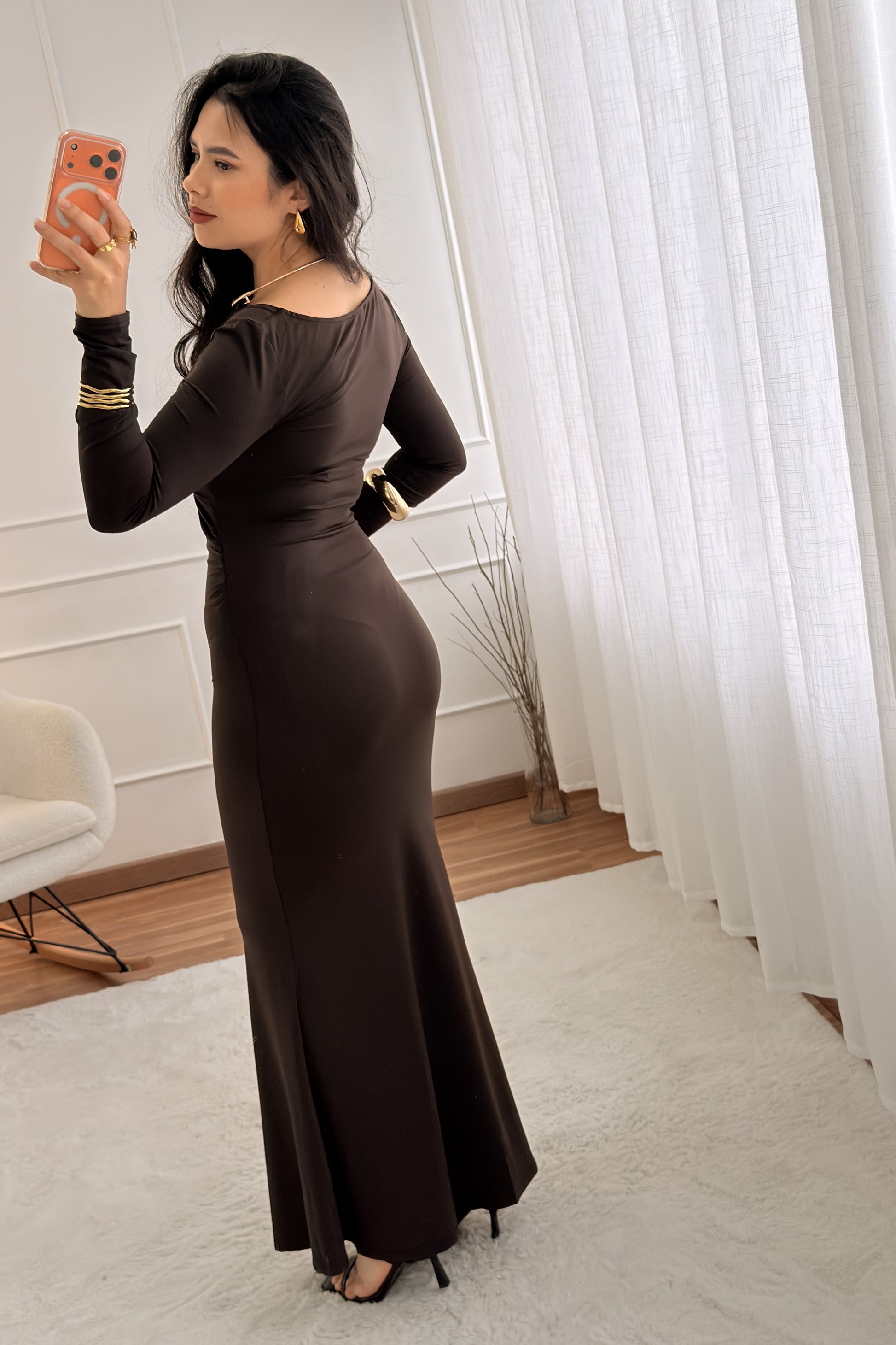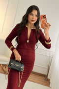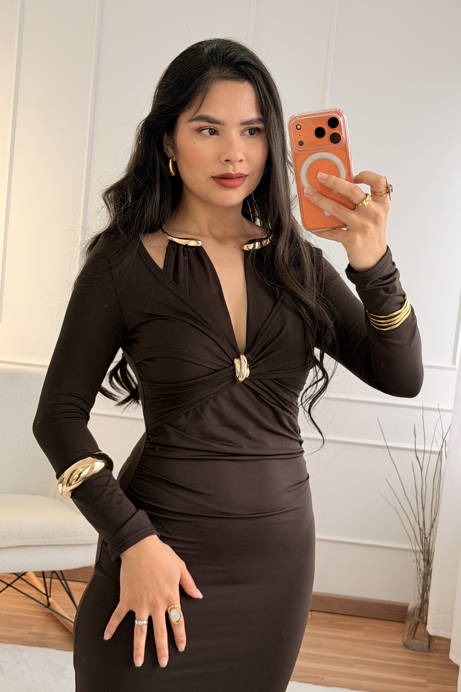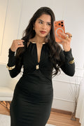 Elegante e sofisticado, este vestido 2.0 com mangas longas e decote drapeado realça a silhueta com um toque moderno. Os detalhes metálicos nos ombros acrescentam um charme refinado, enquanto o tecido elástico adapta-se ao corpo, garantindo conforto e um caimento perfeito.