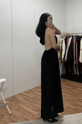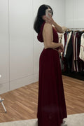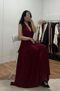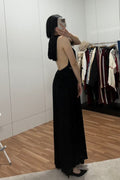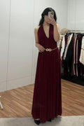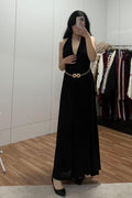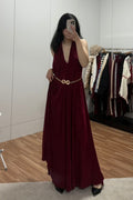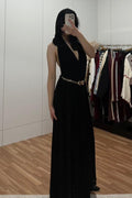 Vestido chique comprido com capuz e uma corrente na cintura à frente.