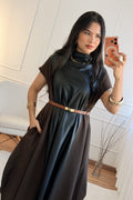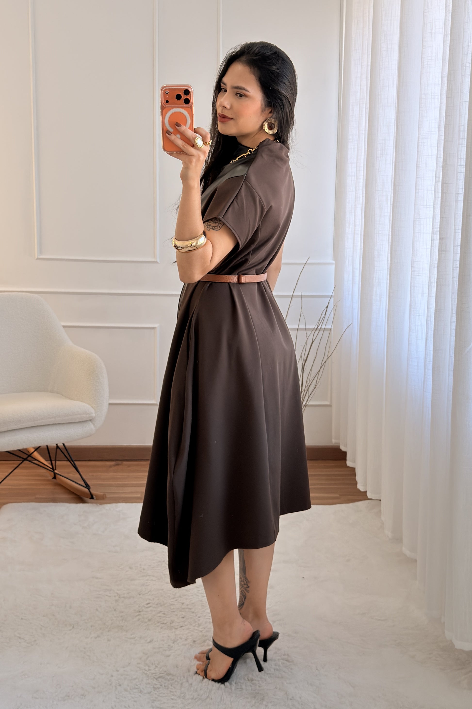 • Vestido midi moderno com frente em efeito pele e laterais em tecido elástico confortável