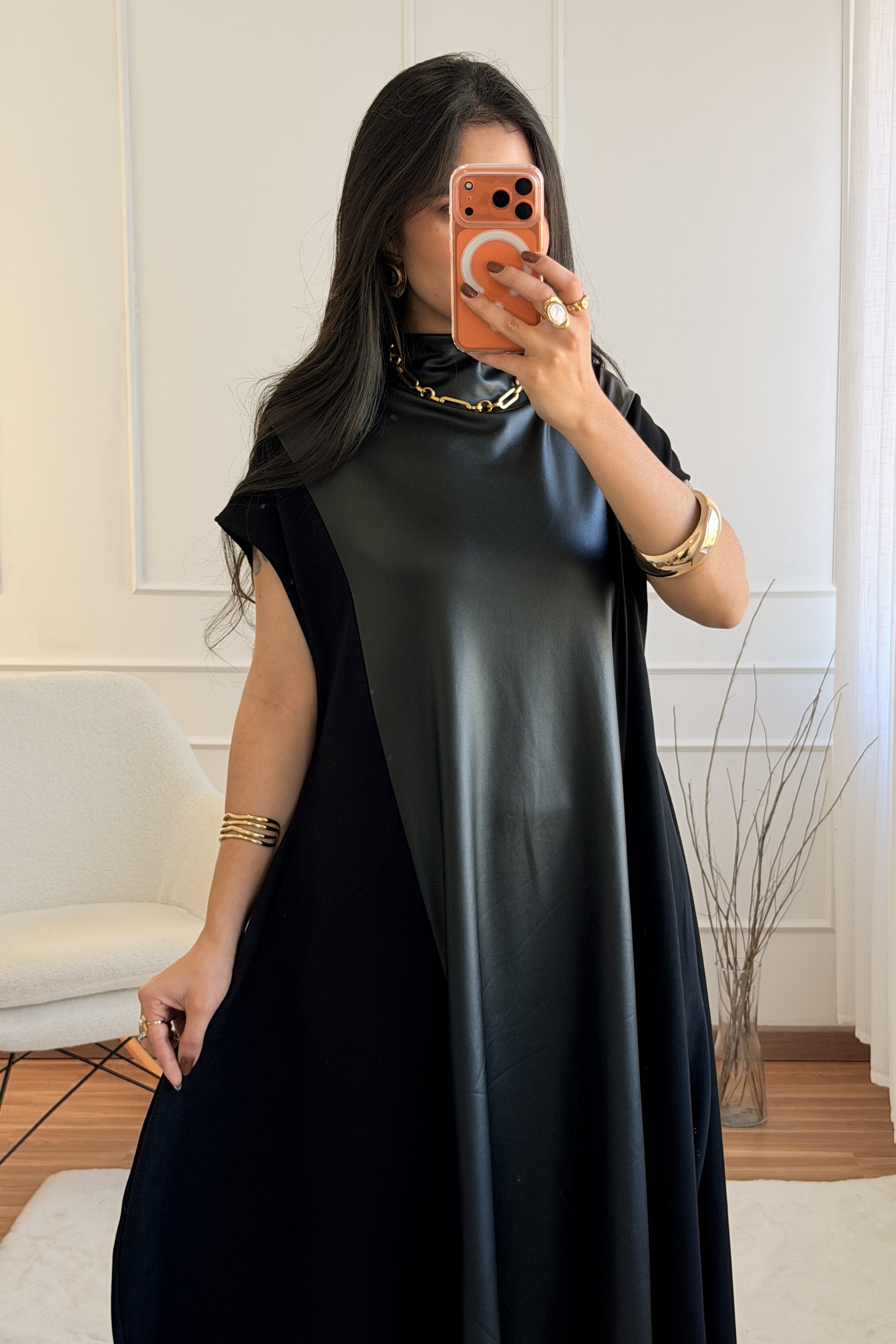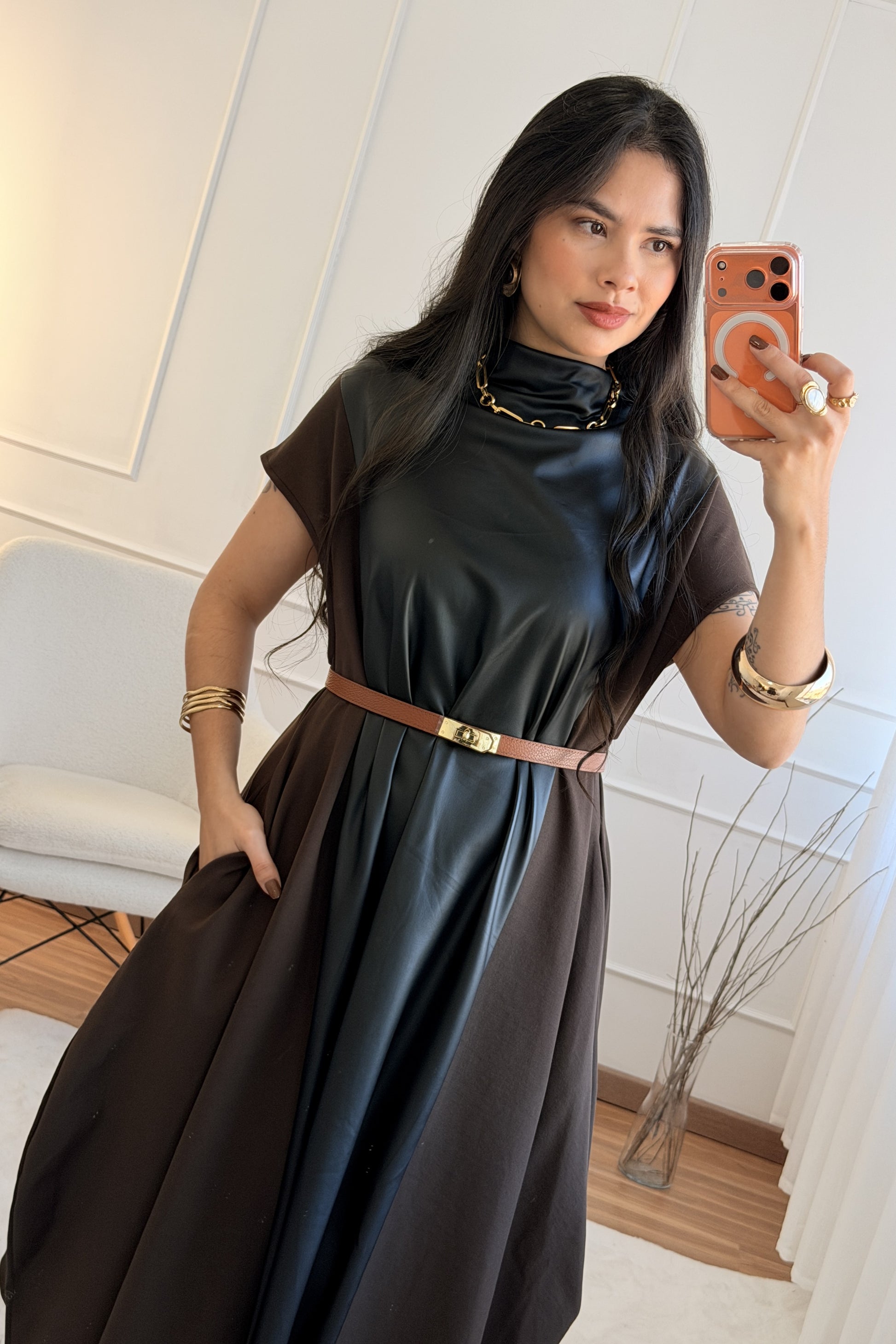 Vestido bicolor misto e efeito pele