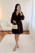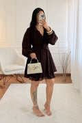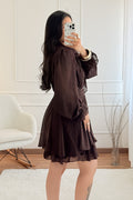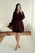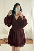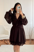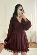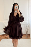 Este vestido é a definição de romantismo e sofisticação. Com decote em V adornado por babados delicados, mangas longas com transparência suave e cintura marcada com faixa, proporciona um caimento leve e elegante. A saia fluida em camadas traz movimento e feminilidade à peça