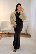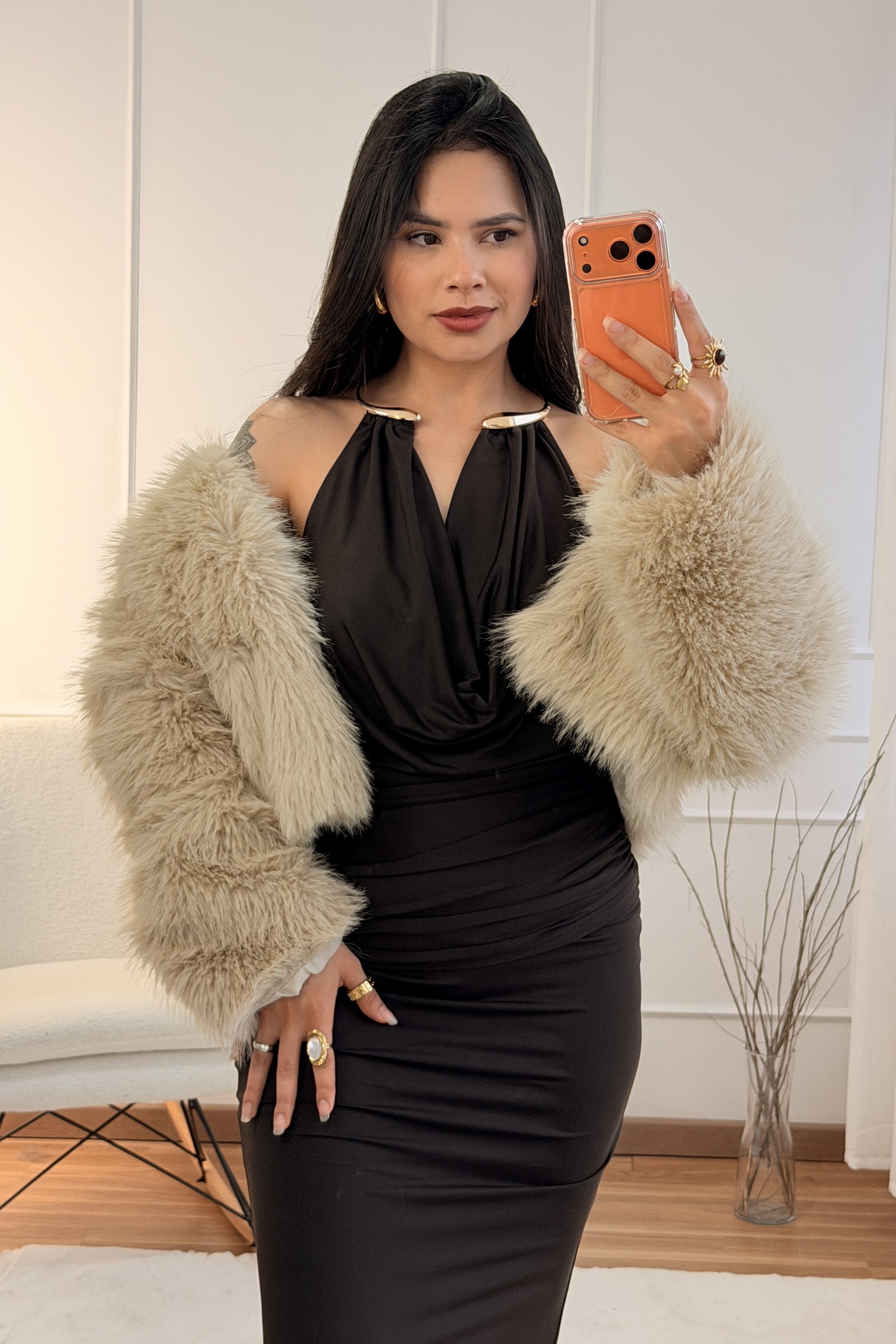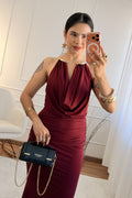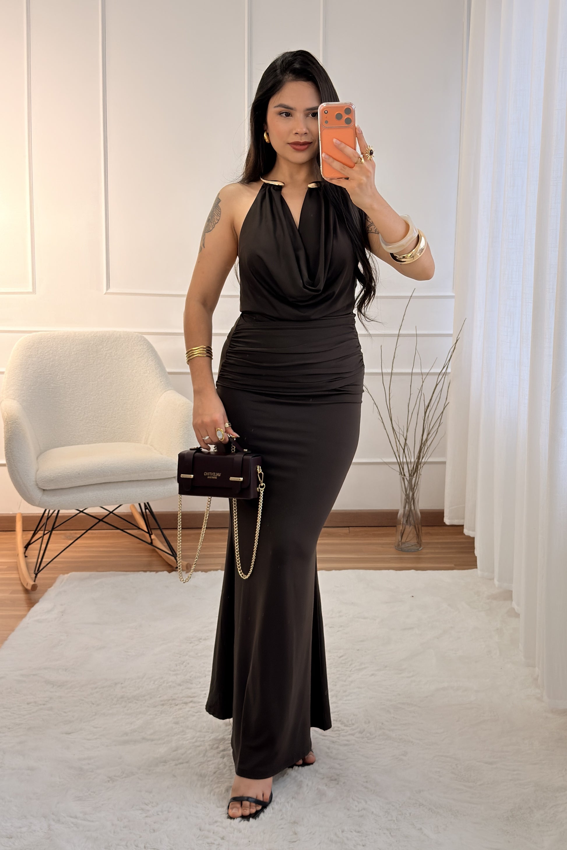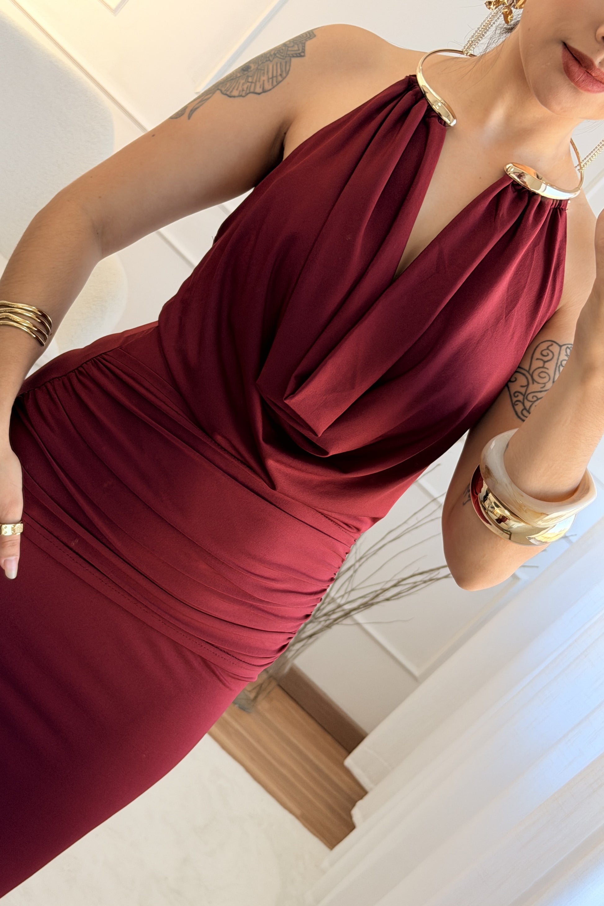Elegante e sofisticado, este vestido com decote drapeado e detalhes metálicos nos ombros realça a silhueta com um toque moderno. O tecido elástico adapta-se ao corpo, garantindo conforto e um caimento perfeito