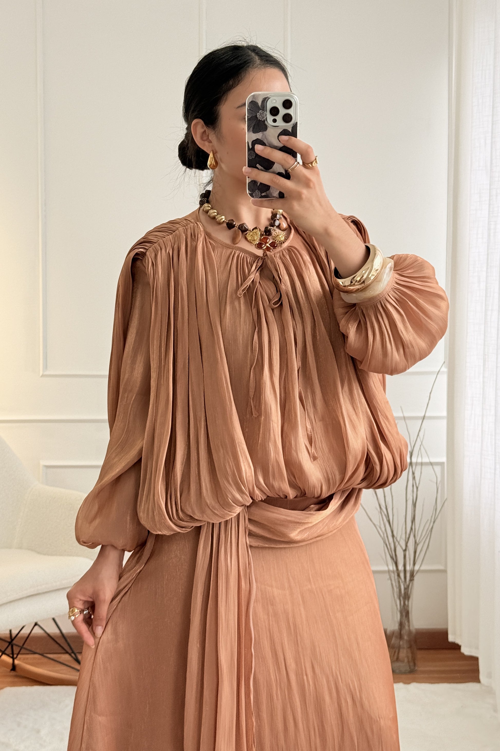 Vestido com corte fluido e mangas amplas plissadas que conferem movimento e elegância. Possui detalhe de laço na gola e fecho lateral invisível para maior conforto. A cintura levemente marcada valoriza a silhueta, tornando