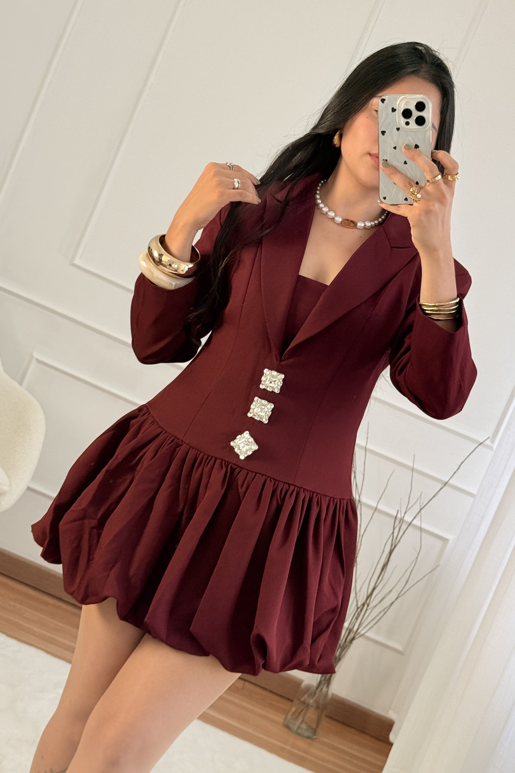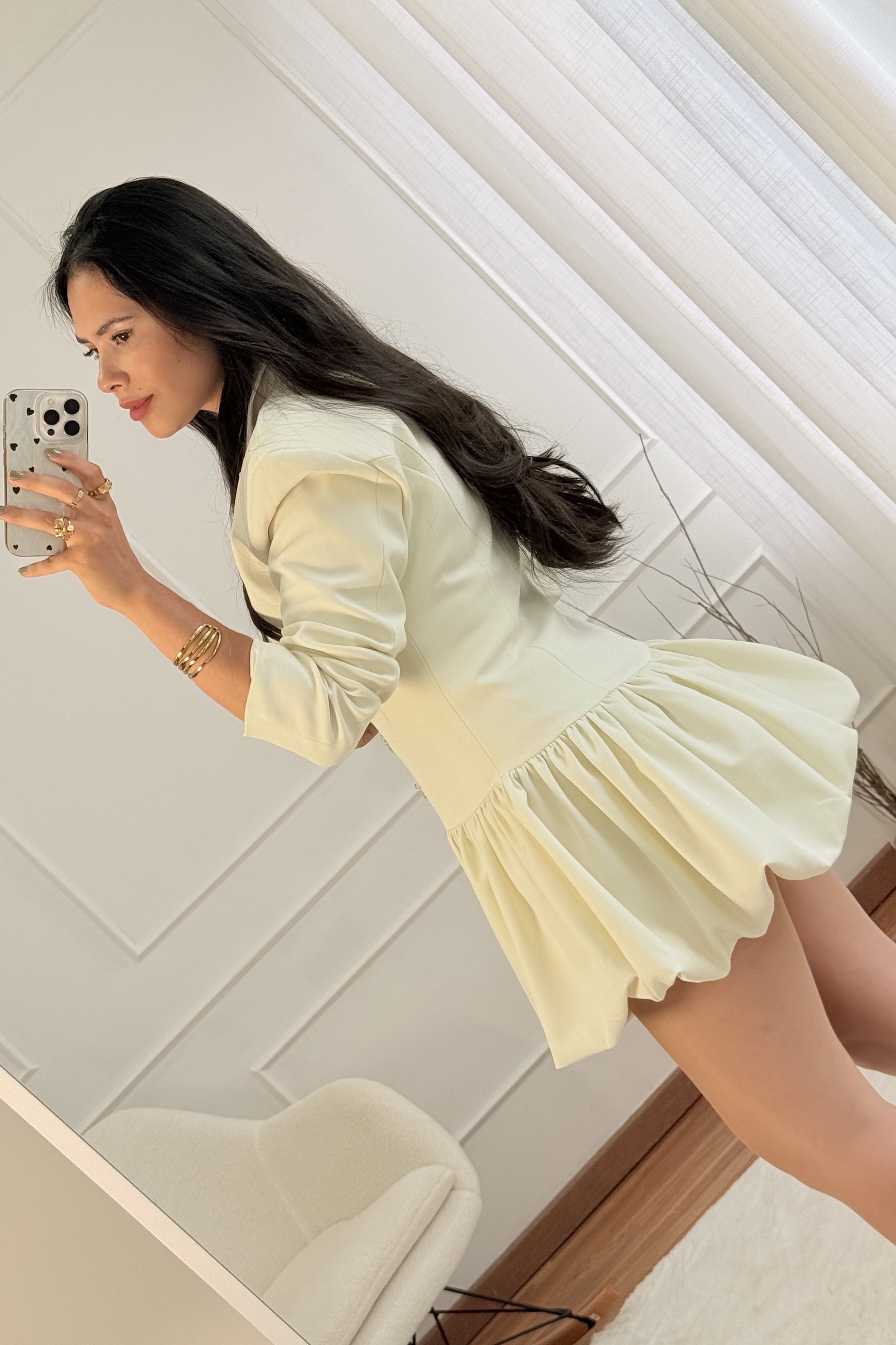 Vestido curto inspirado no blazer, com lapela clássica, três botões decorativos e cintura ajustada. Saia franzida que acrescenta movimento e fecho lateral invisível para maior praticidade.