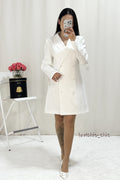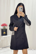 Este vestido apresenta um design sofisticado com franjas feitas de corrente de diamantes e botões duplos, adicionando um toque de glamour. O corte elegante e os detalhes refinados tornam-no perfeito para ocasiões especiais.