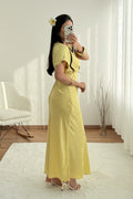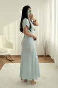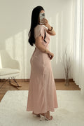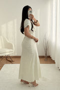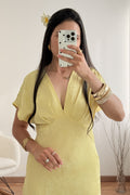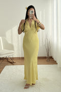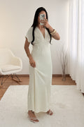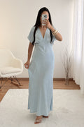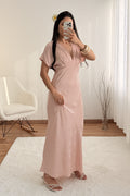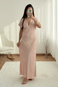 Este vestido longo apresenta um decote em V profundo e mangas curtas fluidas que conferem leveza ao visual. O tecido acetinado com padrão jacquard discreto adiciona sofisticação e textura. Um corte ajustado valoriza a silhueta com elegância e suavidade.
