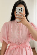 Vestido com forro e cinto incluído, adornado com pequenas pedras brilhantes que conferem um toque extra de elegância.