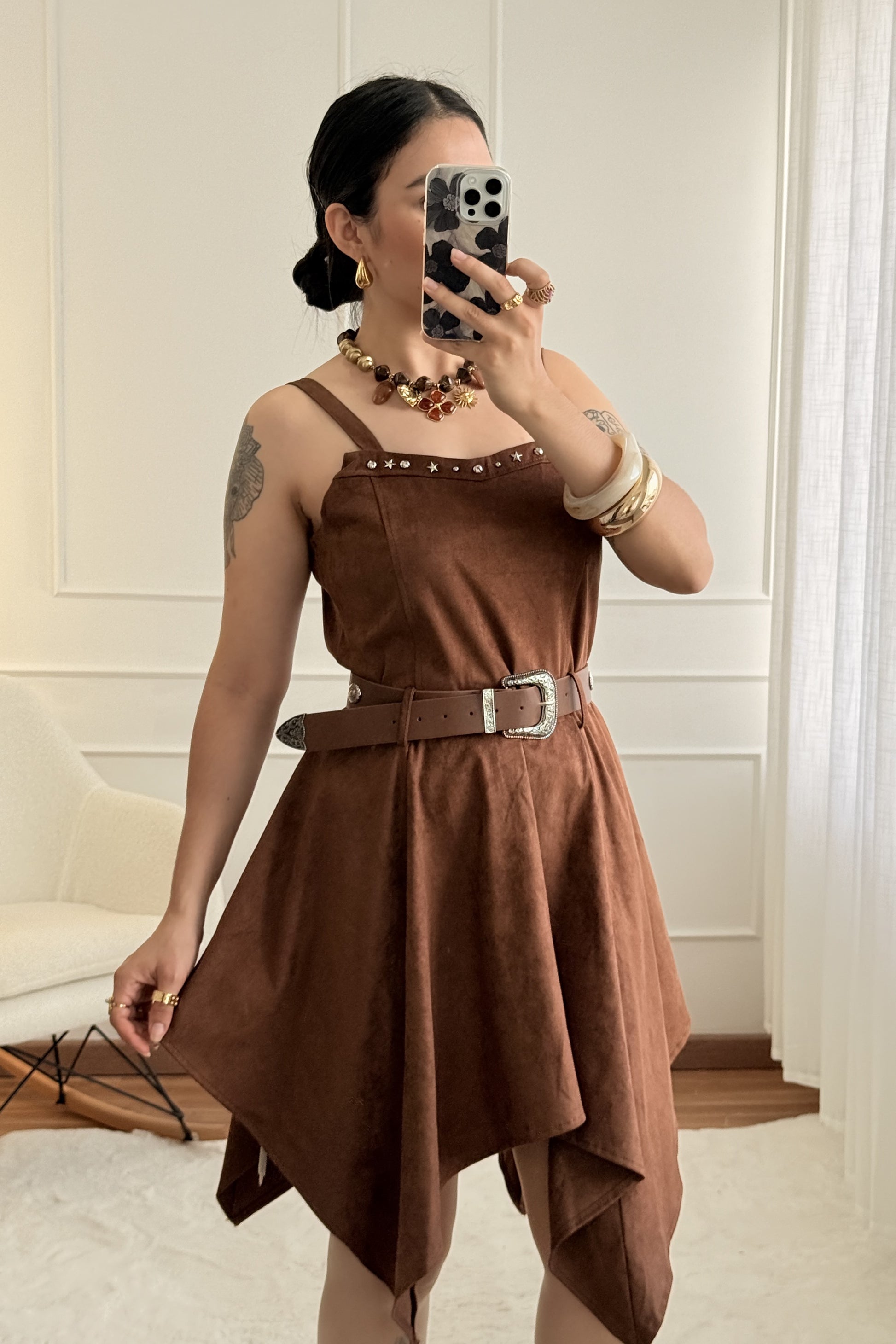 Vestido em camurça macia, com alças largas e aplicações metálicas decorativas na zona do decote. O design apresenta cinto ajustável com fivela trabalhada e saia de corte assimétrico que acrescenta movimento e estilo único. Ideal para um look ousado e moderno.