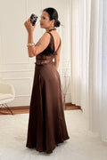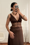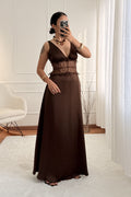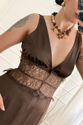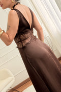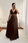 Vestido comprido em cetim, com decote em V e detalhe de renda na cintura, criando um efeito elegante e sofisticado. Ideal para ocasiões especiais.
