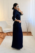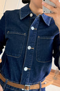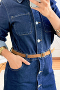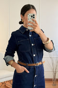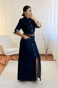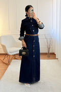 Este vestido comprido em ganga destaca-se pelo design moderno e confortável.