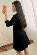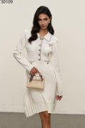 Vestido elegante em malha, com gola clássica e botões tipo pérola.