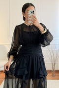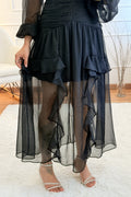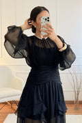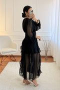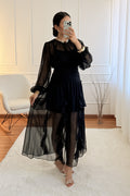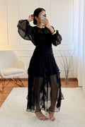 Este vestido midi em organza destaca-se pela sua leveza e sofisticação. As mangas compridas em tecido translúcido acrescentam delicadeza, enquanto a cintura marcada realça a silhueta. A saia fluida em camadas cria movimento e um efeito romântico,