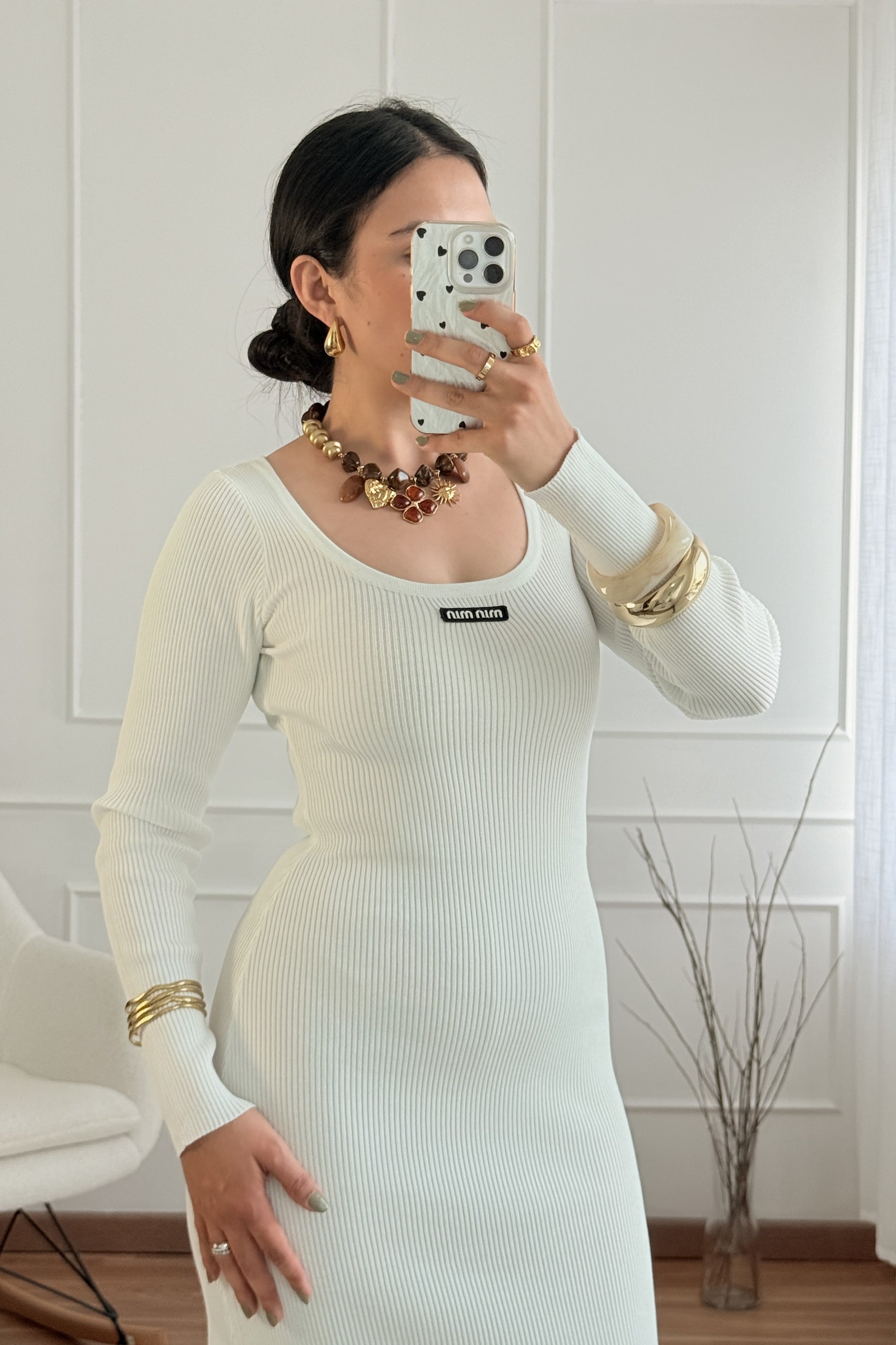 Vestido decote redondo, mangas compridas com detalhe em punho e corte justo que valoriza a silhueta. Toque sofisticado com logótipo minmin na frente