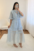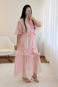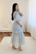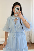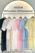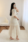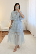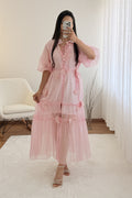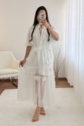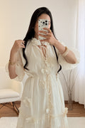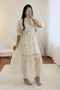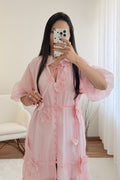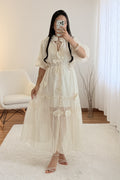 Este vestido encanta com o seu tecido leve e transparente, mangas volumosas e aplicações florais delicadas. Um look etéreo e encantador, perfeito para ocasiões especiais ou dias em que queres sentir-te única.