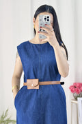 Vestido de ganga com boa aparência, sem mangas, acompanhado de um cinto com um pequeno porta-moedas. A parte das costas e a barra da saia têm um design com fendas.