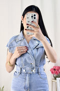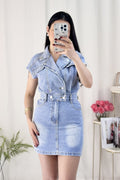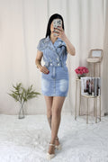 Vestido ganga curto e justo, com parte superior no design de casaco com gola vira. Sem mangas.