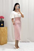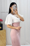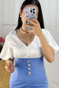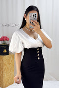 Vestido com parte superior de decote em V e mangas bufantes, combinando com a parte inferior justa, criando um contraste elegante e moderno.