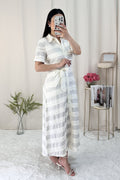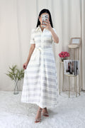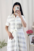 Vestido longo de mangas curtas listrado, feito de um tecido confortável e com elasticidade. Ele tem uma gola com uma fileira de botões brancos e vem acompanhado de uma faixa de cetim como cinto.