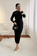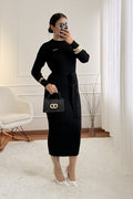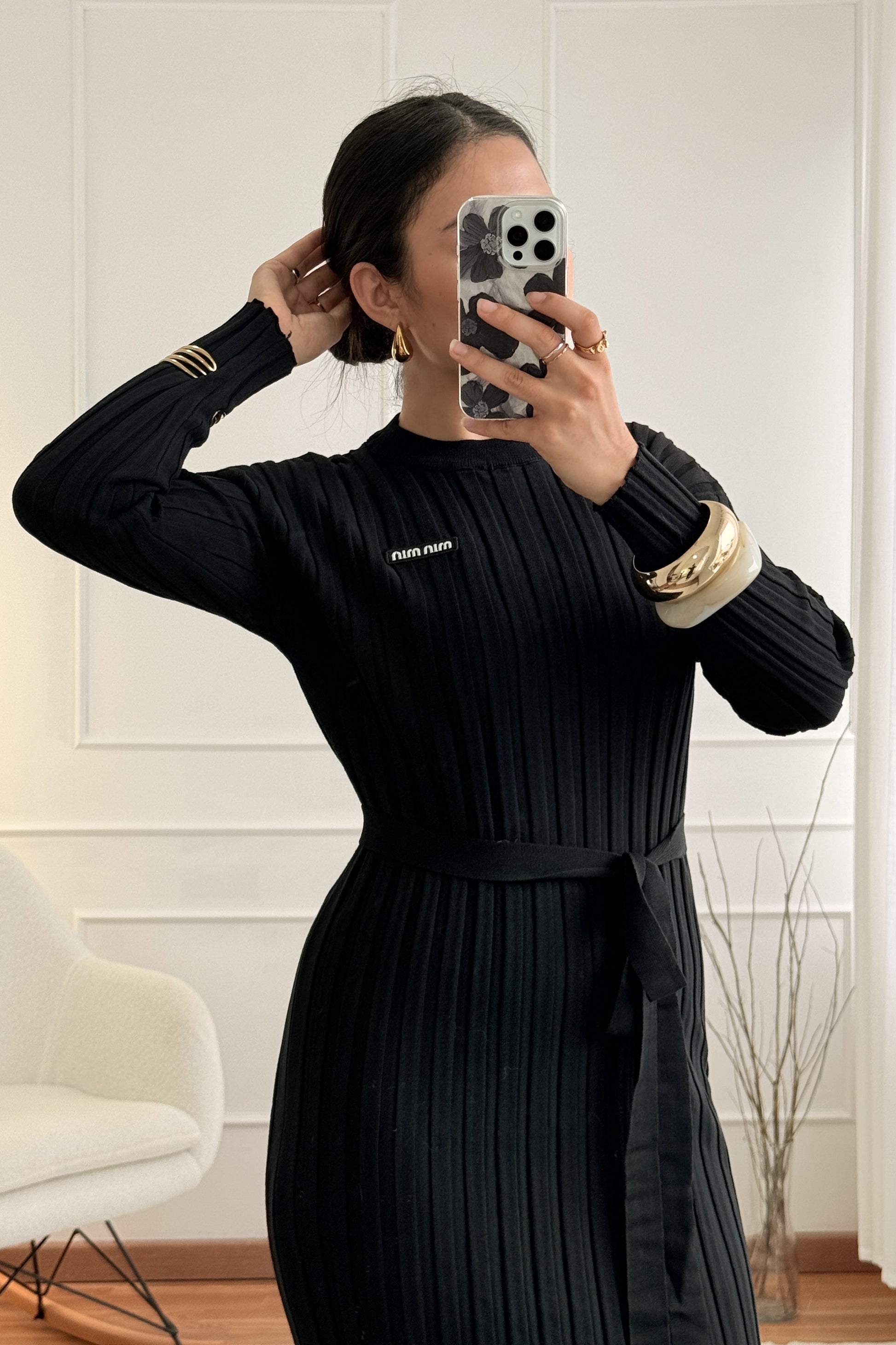 Vestido em malha canelada, manga comprida, com cinto do mesmo tecido para realçar a silhueta. Confortável e elegante para várias ocasiões.