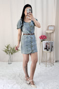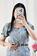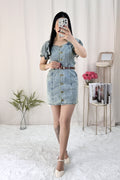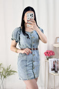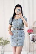 Vestido ganga curto e justo, com uma fileira de botões na frente. As mangas têm design de balão e vem acompanhado de um cinto marrom.