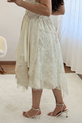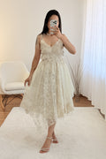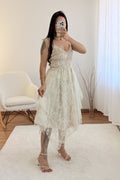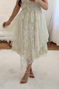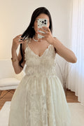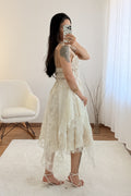 Modelo leve e delicado com alças finas ajustáveis e saia com sobreposição de renda. Um visual romântico e feminino, ideal para dias especiais ou passeios de verão.