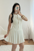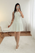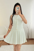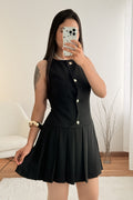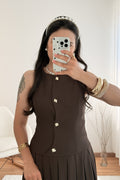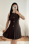 Este vestido sem mangas destaca-se pelo corte elegante e botões delicados. A saia plissada confere leveza e movimento, ideal para um look sofisticado com um toque clássico.