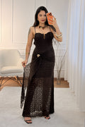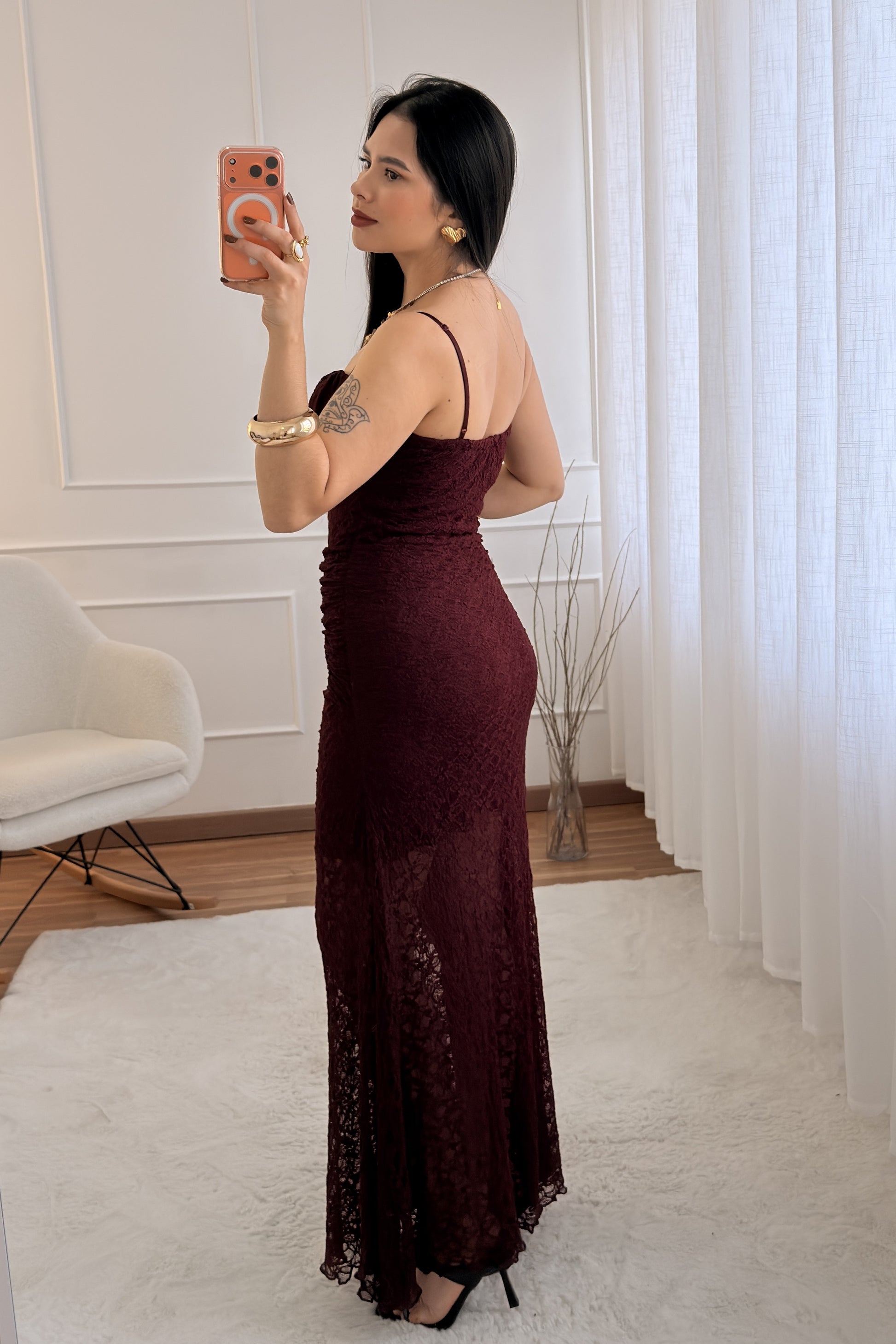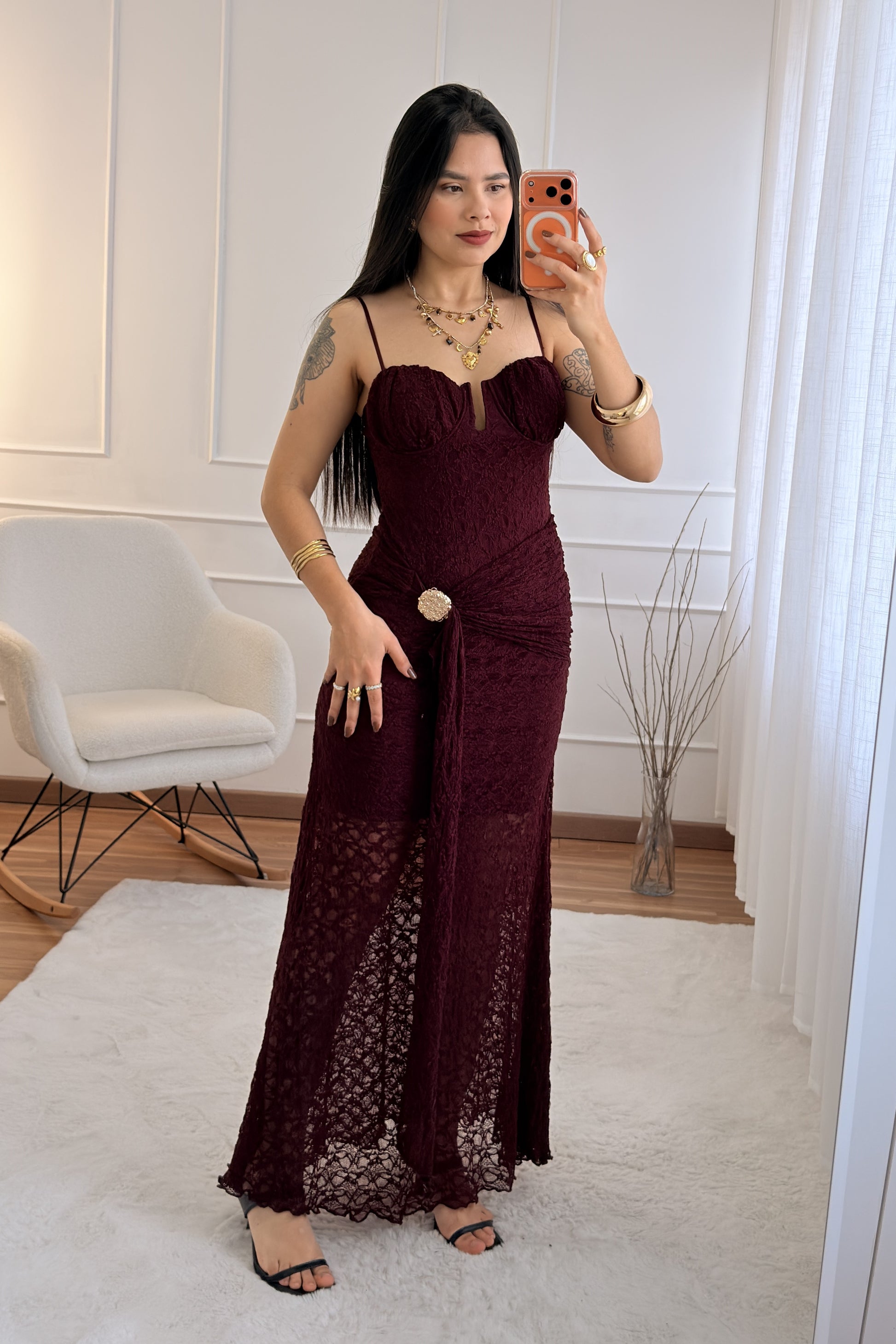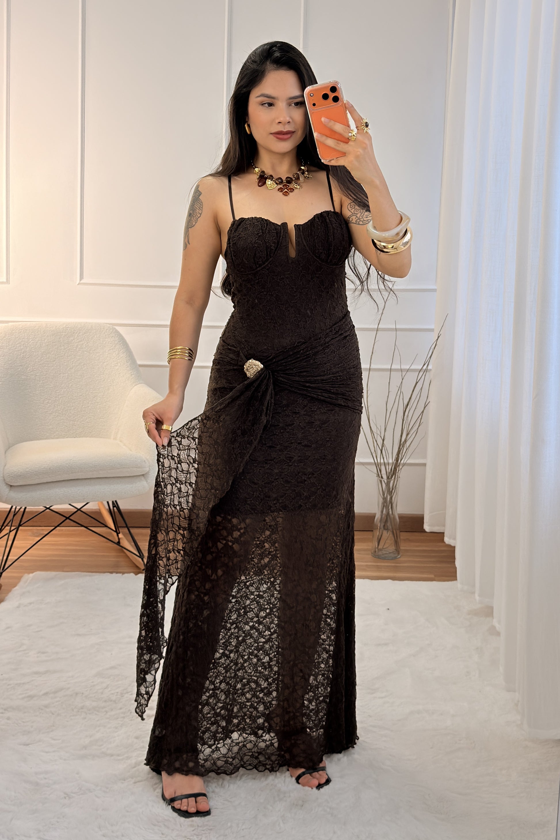 Vestido longo em renda com corte justo e elegante, detalhe de torção lateral com aplicação decorativa. Possui forro curto interior, proporcionando conforto e leve transparência na parte inferior. As alças finas e o decote estruturado realçam a silhueta feminina.
