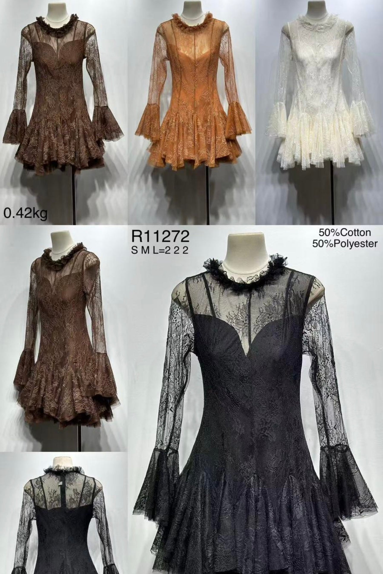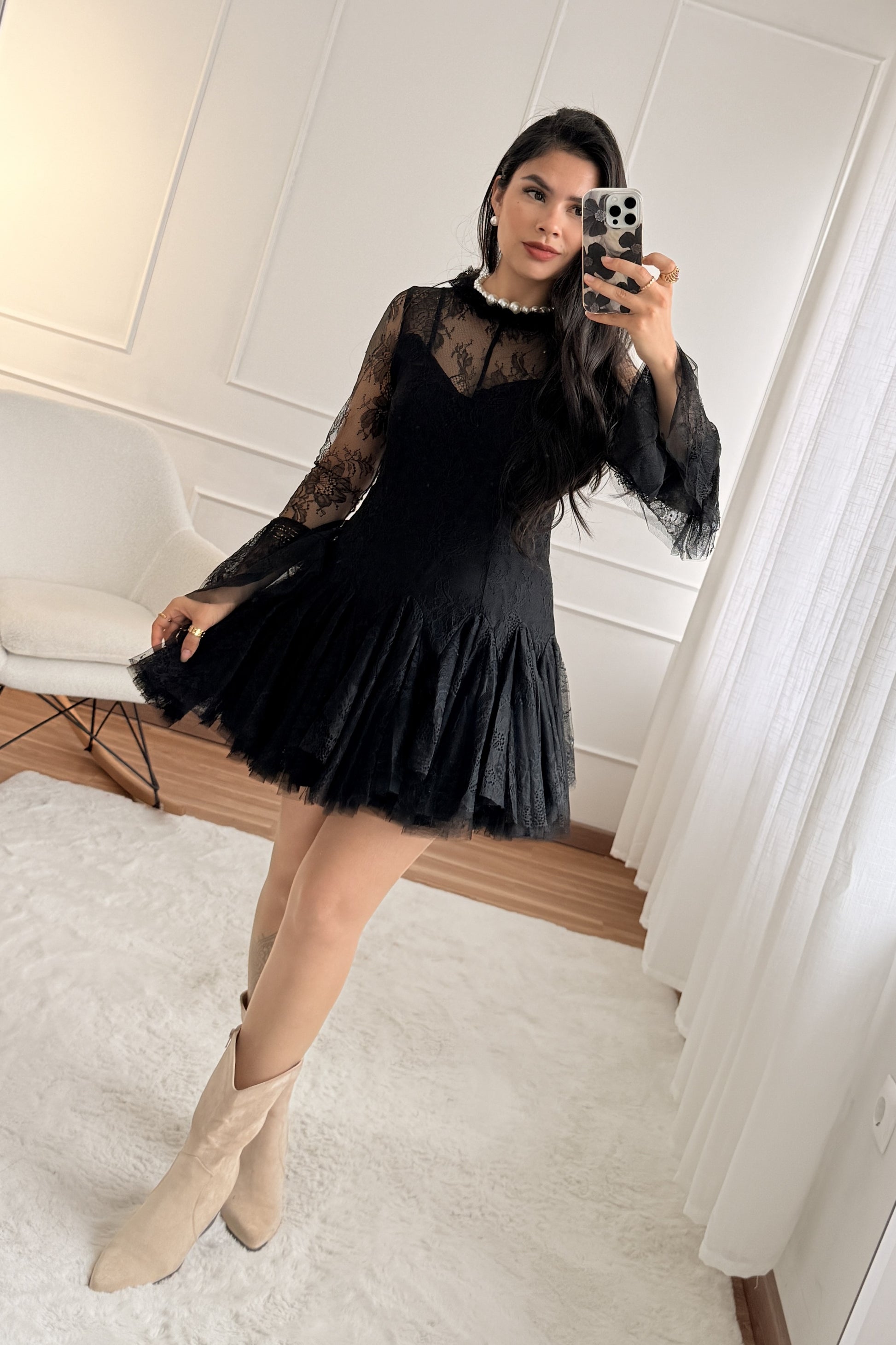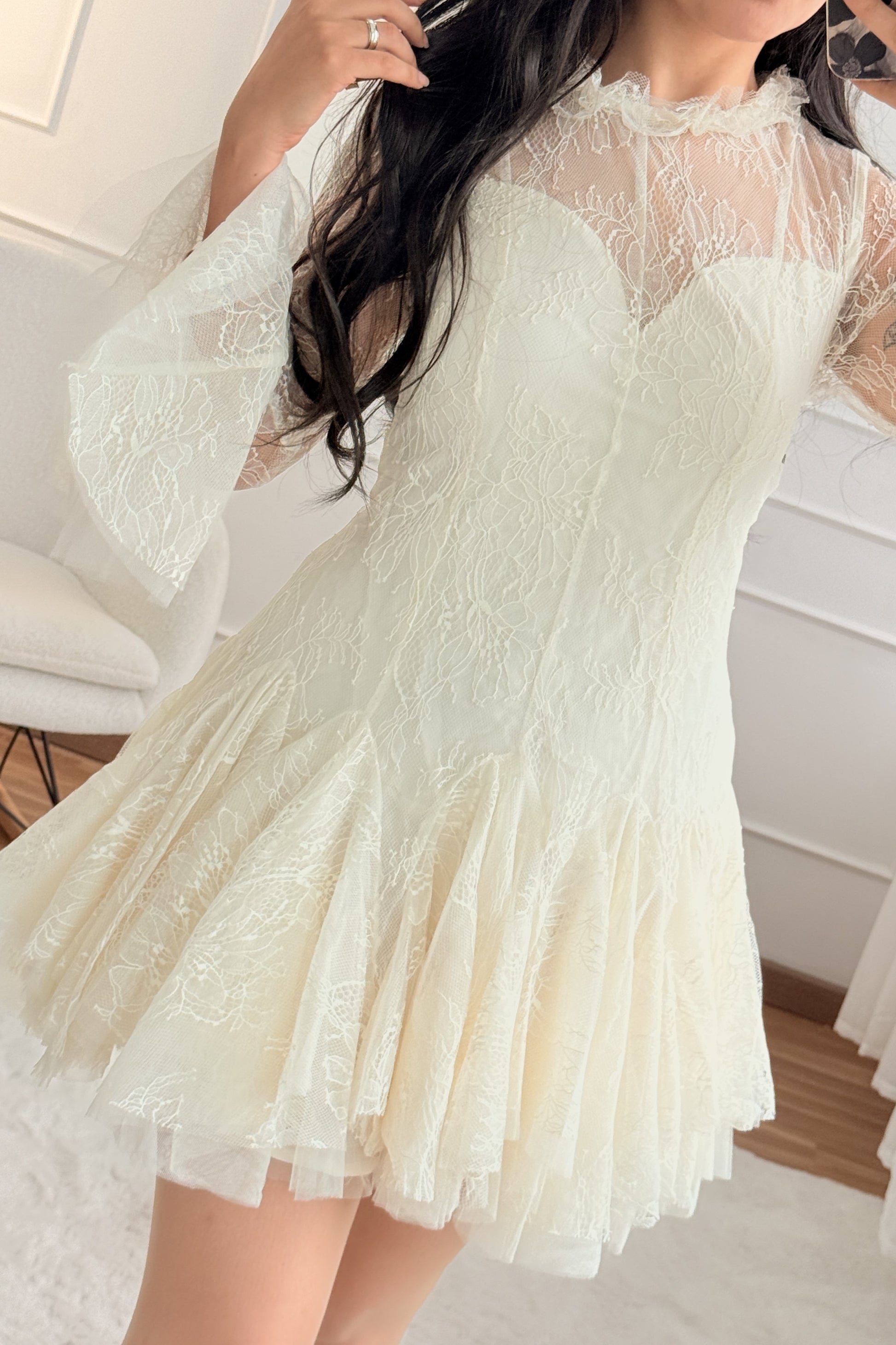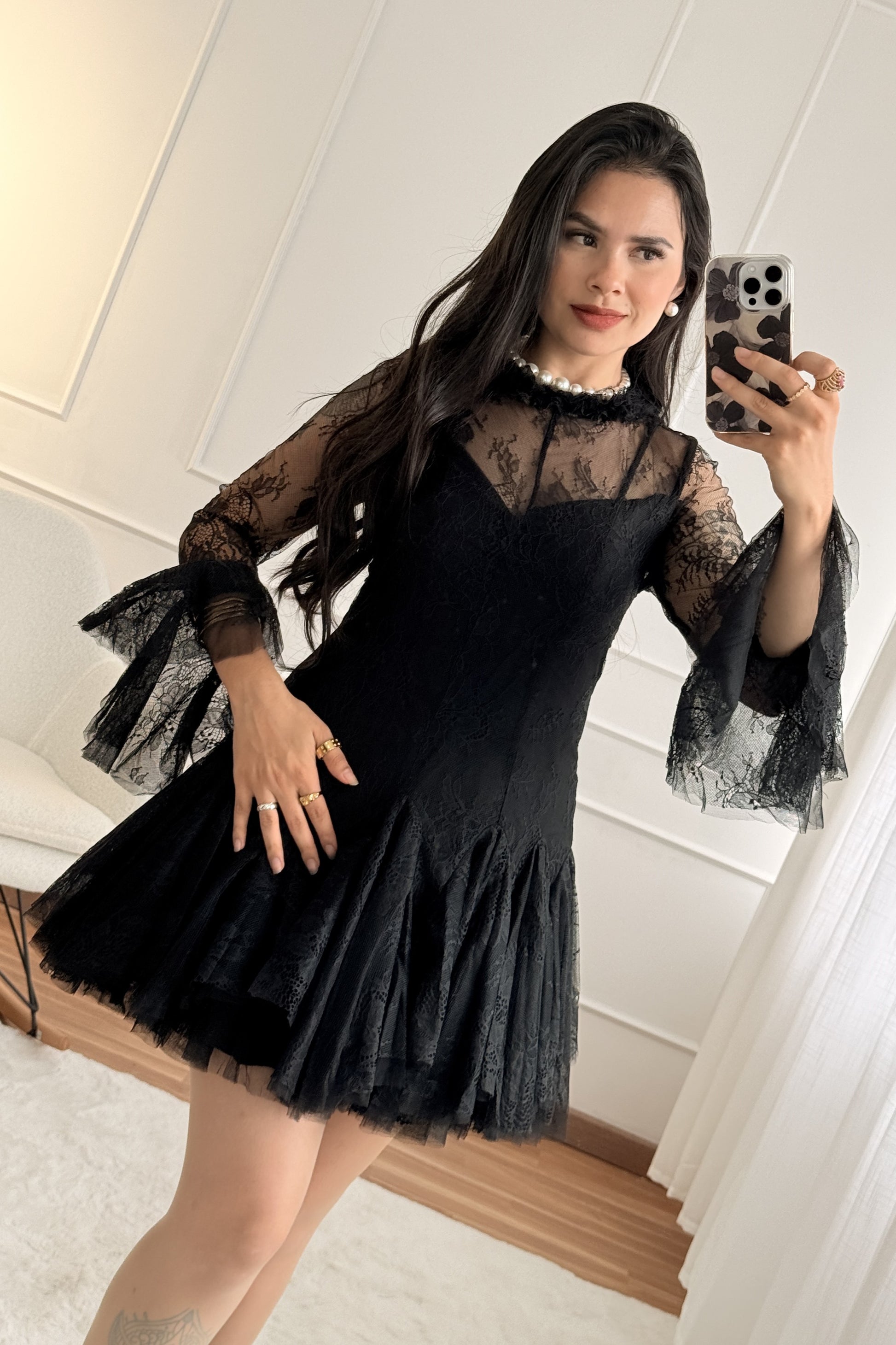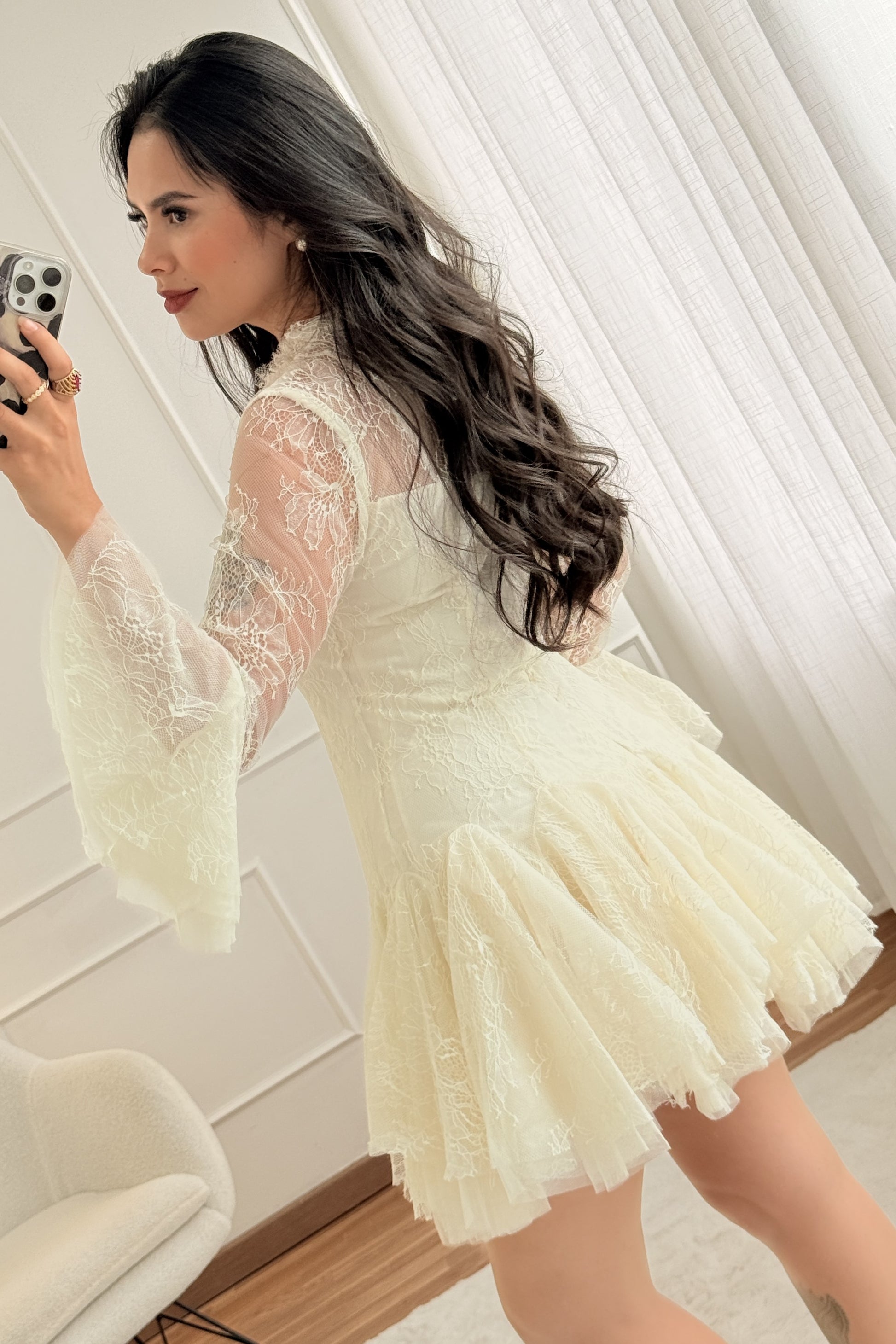 Vestido curto em tecido delicado de renda, com corte justo no corpo e saia rodada em camadas que cria movimento elegante. Possui decote semi-transparente com detalhe subtil de folho e mangas compridas em renda fluída, que acrescentam sofisticação e feminilidade.