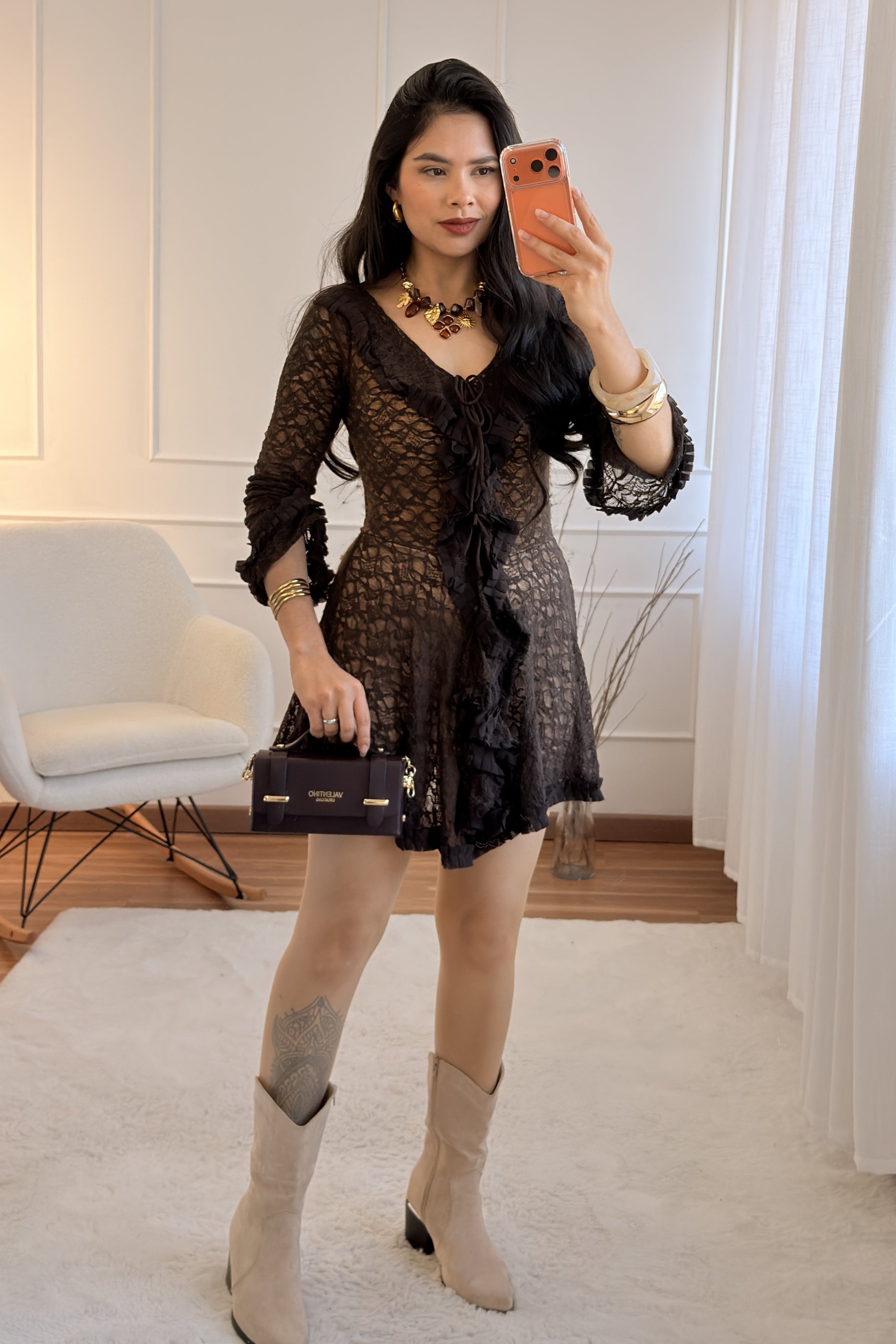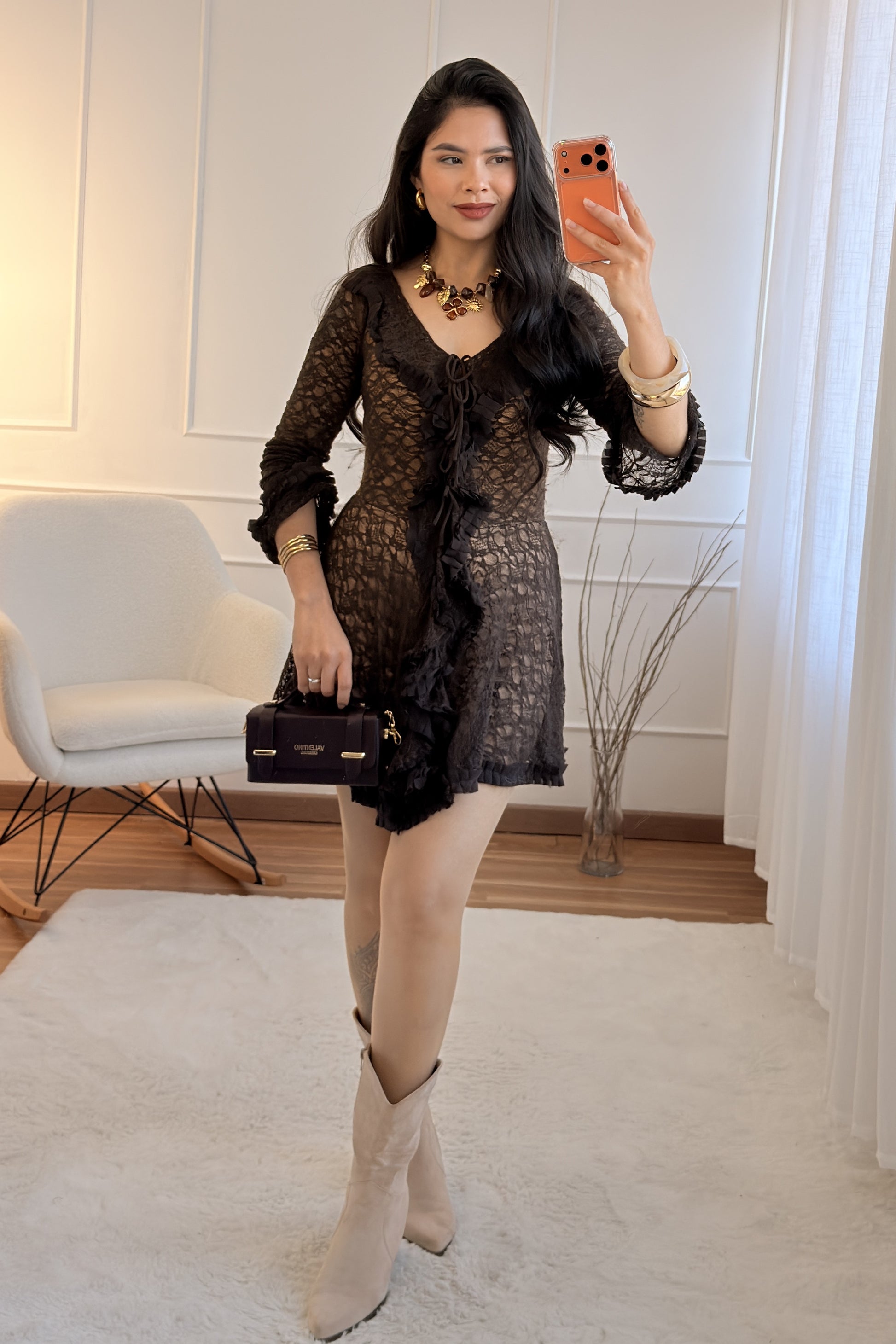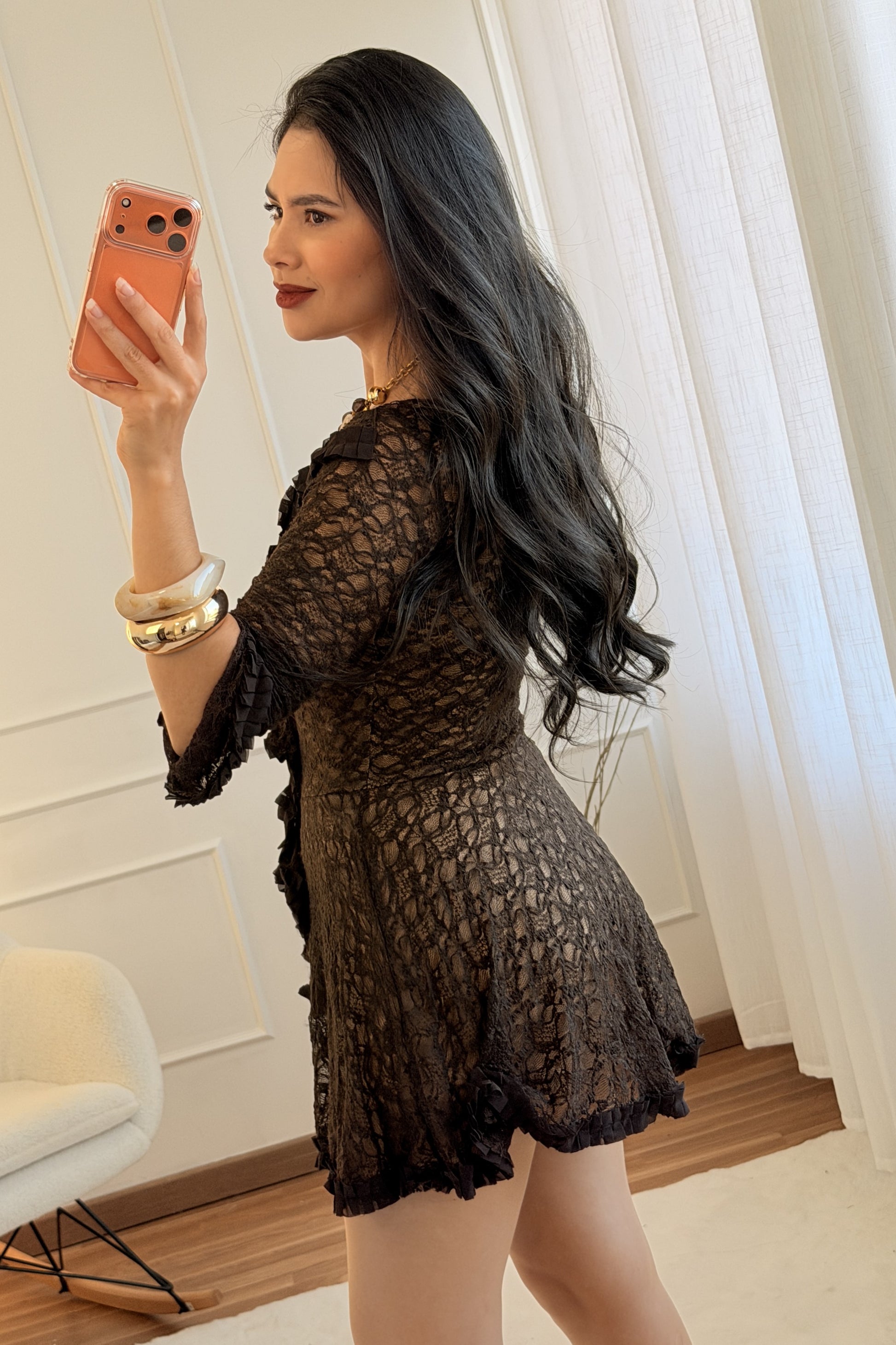 Vestido curto em renda com detalhe de folhos na frente e nas mangas. Tecido elástico e confortável, com forro interior em formato de macaquinho (inteiriço). Corte feminino e elegante, ideal para ocasiões especiais.
