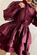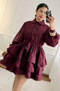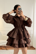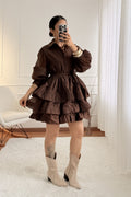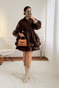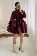 Detalhes marcantes: mangas bufantes transparentes, cintura ajustável e saia em camadas que realça a silhueta.
