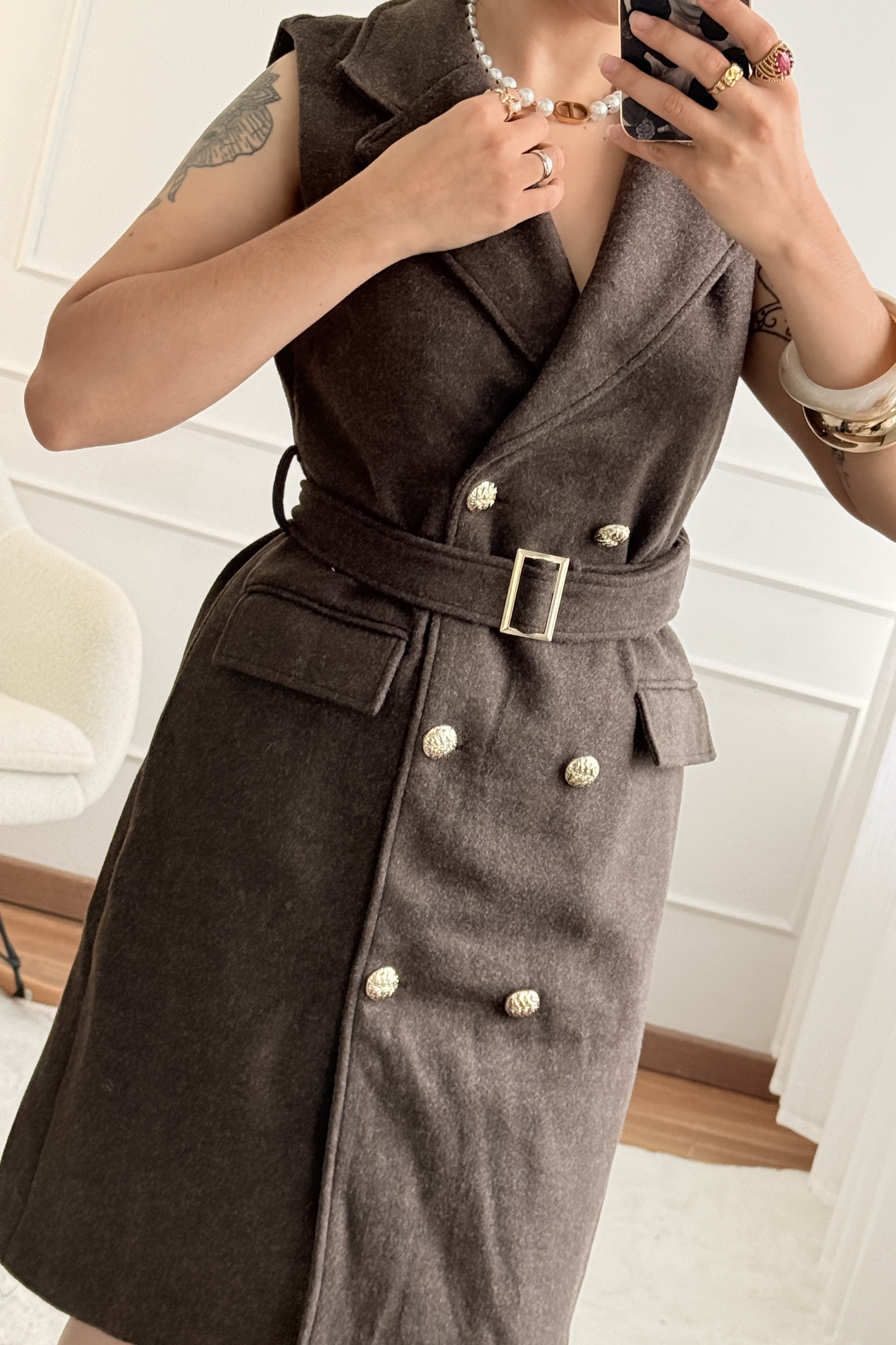 Vestido elegante sem mangas, com botões duplos e cinto para marcar a cintura. Modelagem estruturada, perfeito para um look sofisticado.