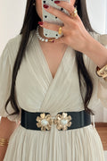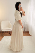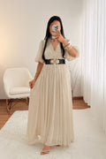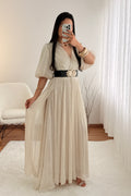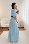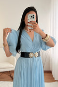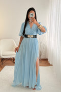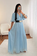 Este vestido é aquele toque de elegância. Fluido, delicado e com um brilho subtil que encanta! 💙 com cinto