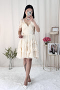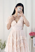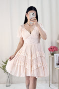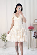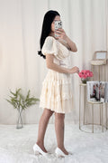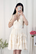 Vestido curto em formato A com decote em V, estilo francês, com saia em camadas e volumosa.